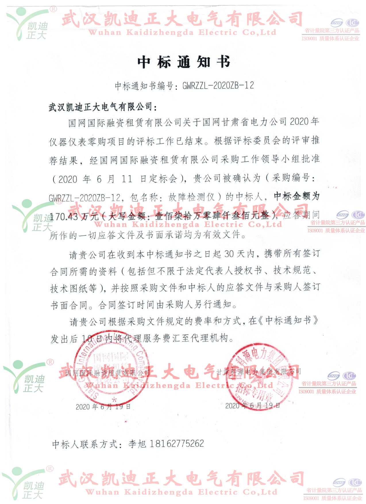 疫情結束了,一年一度的高考也結束了。該是分享成功的時候,我們倍感高興。武漢凱迪正大電氣有限公司迎來了國網國際融資租賃有限公司的中標通知書,這是疫情解封武漢市以來我司獲得的第9張中標通知書,中標金額排名第三!