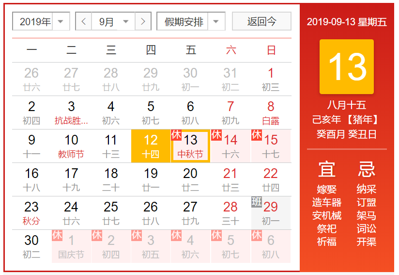 根據國務院2019年中秋節(jié)放假通知: