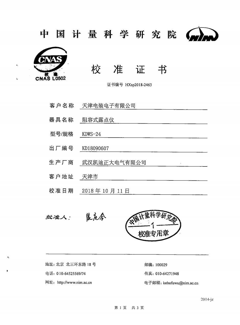 2018年10月,由天津電裝電子公司采購凱迪正大牌KDWS-24高精度露點(diǎn)儀,產(chǎn)品編號(hào)KD18090607,生產(chǎn)廠商:武漢凱迪正大電氣有限公司。校準(zhǔn)日期:2018年10月11日。