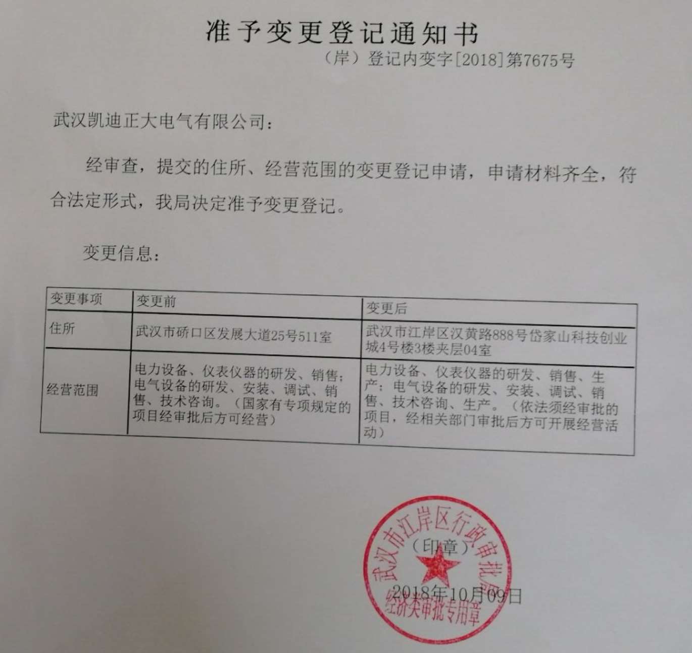 變更后:武漢市江岸區(qū)漢黃路888號(hào)岱家山科技創(chuàng)業(yè)城4號(hào)樓3樓夾層04室 經(jīng)營(yíng)范圍:電力設(shè)備、儀表儀器的研發(fā)、銷售、生產(chǎn);電氣設(shè)備的研發(fā)、安裝、調(diào)試、銷售、技術(shù)咨詢、生產(chǎn)。(依法須經(jīng)審批的項(xiàng)目,經(jīng)相關(guān)部門審批后方可開展經(jīng)營(yíng)活動(dòng))