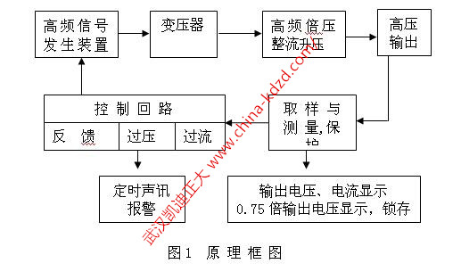 KDZG系列便攜式直流高壓發(fā)生器采用倍壓電路,率先應(yīng)用最新的PWM脈寬調(diào)制技術(shù),閉環(huán)調(diào)整,采用了電壓大反饋,使電壓穩(wěn)定度大幅度提高。該發(fā)生器具有紋波系數(shù)小、輸出穩(wěn)定可靠,體積小、重量輕的特點(diǎn),且具有可靠、靈敏的內(nèi)部保護(hù)功能,其原理框圖如圖1所示。