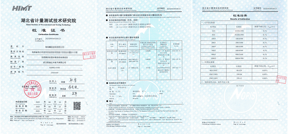 近日,海南某發(fā)電有限公司采購武漢凱迪正大的兩套KDHG-518B互感器伏安變比極性綜合測試儀,均成功通過了湖北省計量測試技術(shù)研究院的嚴格校準,并順利取得校準證書。