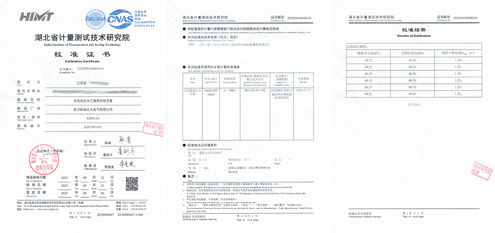江蘇某灌溉單位采購(gòu)武漢凱迪正大KDJS-8A型全自動(dòng)安全工器具試驗(yàn)裝置,經(jīng)湖北省計(jì)量測(cè)試技術(shù)研究院嚴(yán)格校準(zhǔn),取得了編號(hào)為2025DW028600156的校準(zhǔn)證書。